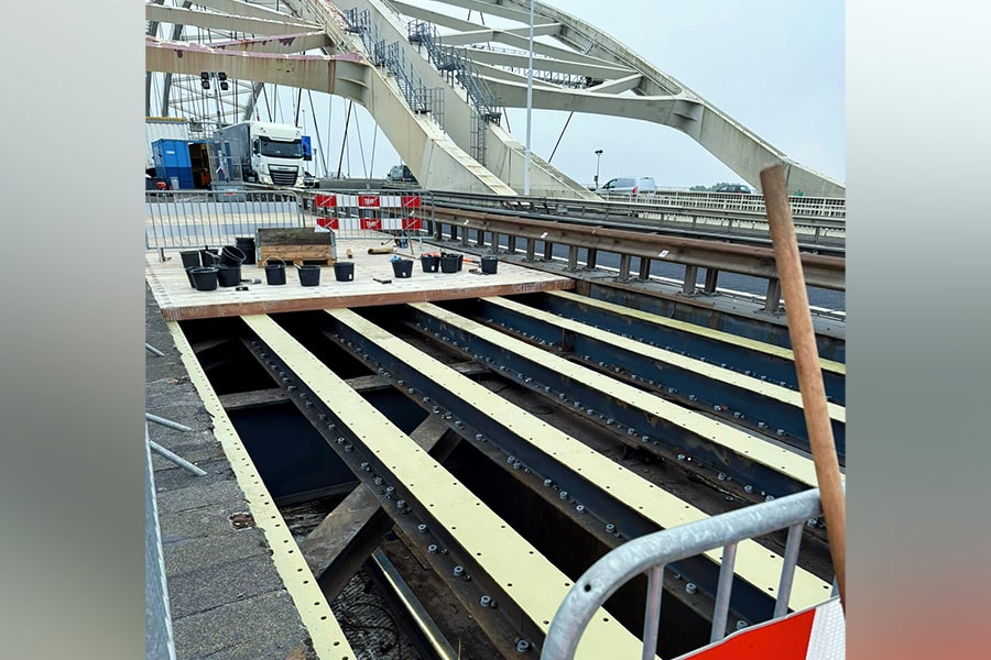 Het daadwerkelijke vervangen van het dek vond plaats tijdens twee lange weekenden, met stremmingen van de A16. “Het uitgangspunt was: als de weg dicht is, moet je er het maximale uithalen”, zegt Den Hoedt. “We wisten dat we strak in de tijd zaten. Dankzij alle voorbereidingen ging het werk sneller dan verwacht. Daardoor konden we zelfs extra asfalt vervangen op de boogbrug, een actie die nog op de lijst stond en door de goede planning direct meegenomen kon worden.” De conservering werd aangepast op de verwachte resterende levensduur van de brug. “In plaats van het gebruikelijke 3-laagssysteem kozen we in overleg met Rijkswaterstaat voor een 2-laagssysteem, passend bij de resterende levensduur van de brug én cruciaal om de strakke planning te halen”, zegt Schreuders.